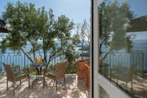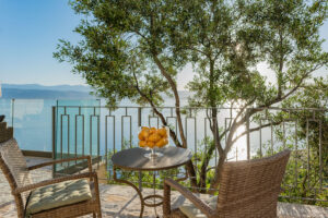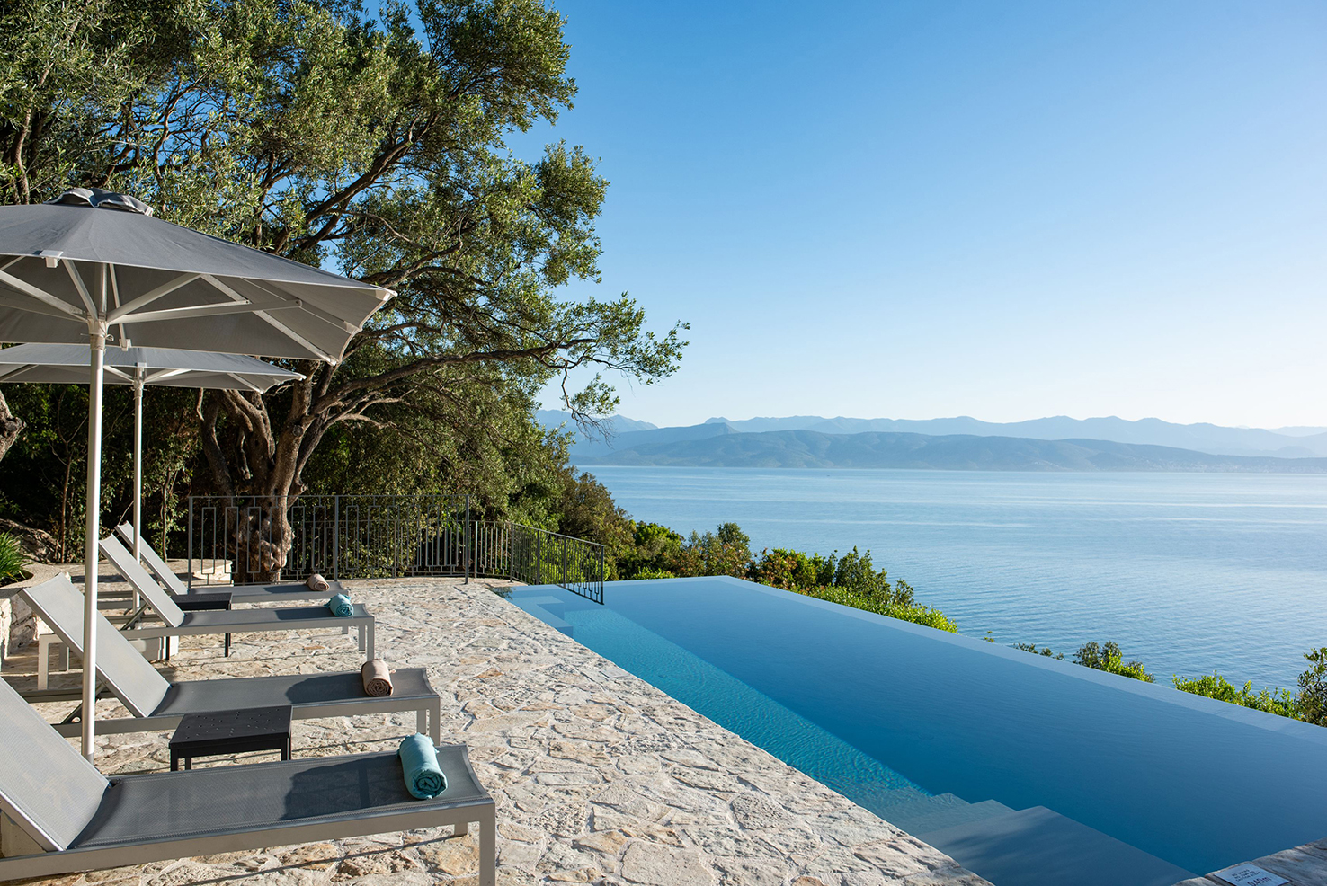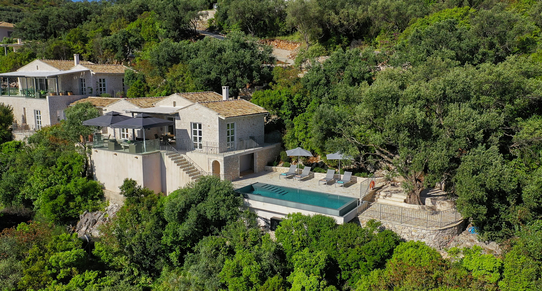 Charming Eos on the beautiful Kardaki Estate is perfect for 2 to 4 guests. With wonderful far reaching views out over the Ionian sea to the mainland beyond, Eos has open plan living areas, a fully equipped part open kitchen, master bedroom with super king bed, en suite shower room and terrace. The second bedroom has a super king/twin beds with en suite showers room. Outside, terraces make the most of the location and the swimming pool forms a focal point for your stay at the villa. For larger groups, Eos can be rented in conjunction with sister villa Gaia which sleeps up to 6 guests in 3 en suite bedrooms. The houses are connected via a storeroom/laundry, but each house is completely autonomous with their own parking, terraces, gardens and pools. The houses are connected by a 20m path, so whilst being separate, guests looking for a shared but separate holiday will enjoy the space Eos and Gaia provide. The villa is just a few minutes drive down to sandy Kalamaki beach and under 10 minutes from vibrant Kassiopi with its boat hire, tavernas, bars and boutiques. Please note there are 34 steps from the drive to the front door of the villa.