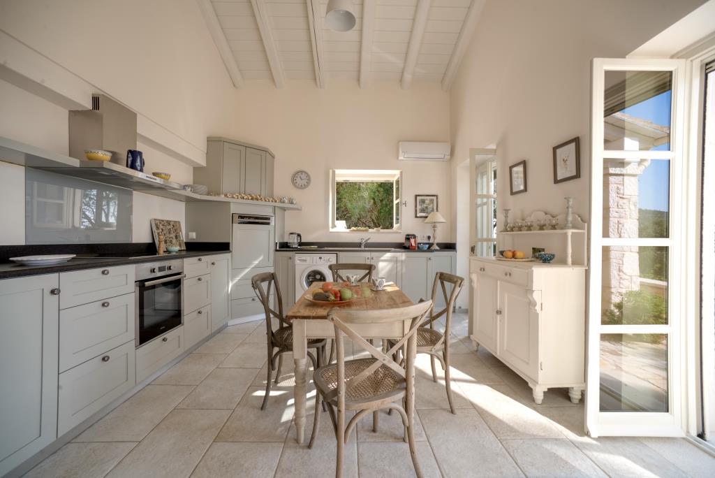 Living spaces: Bright, airy living room with vaulted ceiling and traditional Corfiot fireplace leading into fully equipped eat-in kitchen with French windows in both rooms leading out onto terraces for eating and relaxing.